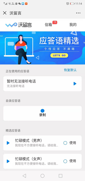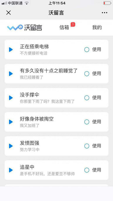 在个性应答应用方面,用户不仅可录制自己的应答语,而且还可使用“沃留言”所提供的各种有趣的“应答语”。不仅有针对商务群体的各种情景模式应答语,如忙碌、开会、开车、休息等常用模式应答语。还有各类适合年轻用户,个性有趣的应答语。此外,业务推广应答和节日活动应答等多种个性化应答内容,将进一步满足不同群体的应用需求。