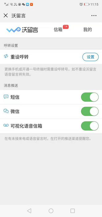 在呼叫场景设置方面,“沃留言”为用户启用了三种不同的场景,分别是无人接听状态下的“无应答”场景;占线、主动挂机状态下的“遇忙”场景;手机关机或无信号状态下的“不可及”场景,可满足用户各种不方便接听、拒接的场景需求。同时用户可以根据个人喜好,选择消息推送方式,包括短信、微信、iPhone可视化语音信箱。