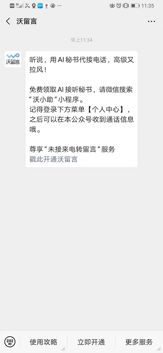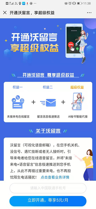 其中,用户可关注“沃留言”服务号,点击“立即订购”进入订购页面进行订购。