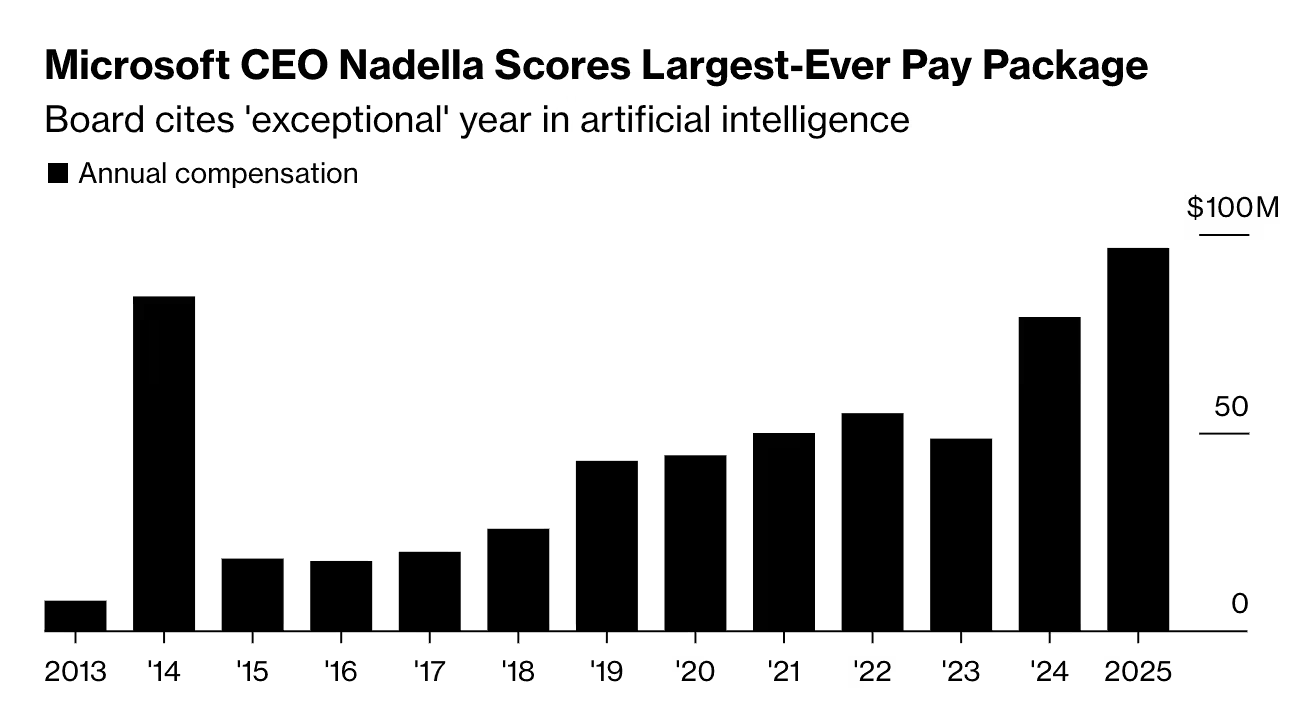 北京时间 10 月 22 日,据彭博社报道,微软公司 CEO 萨提亚・纳德拉 (Satya Nadella) 的 2025 财年薪酬飙升至 9650 万美元 (约合 6.87 亿元人民币),创下他自十多年前担任 CEO 以来的最高薪酬。微软董事会指出,纳德拉带领公司在 AI 领域取得了“非凡”的年度进展。