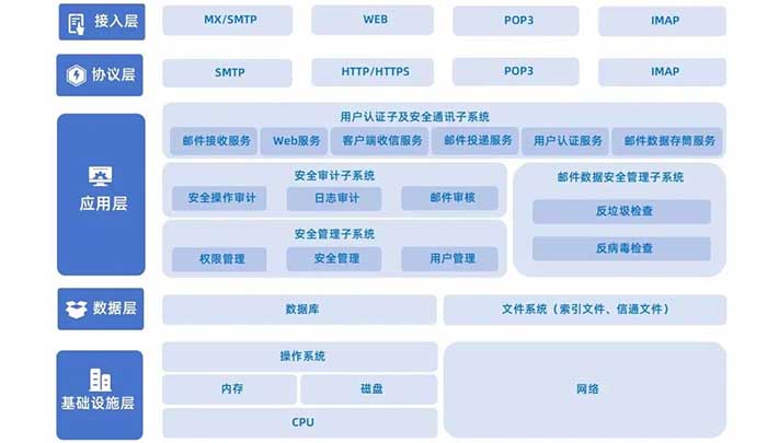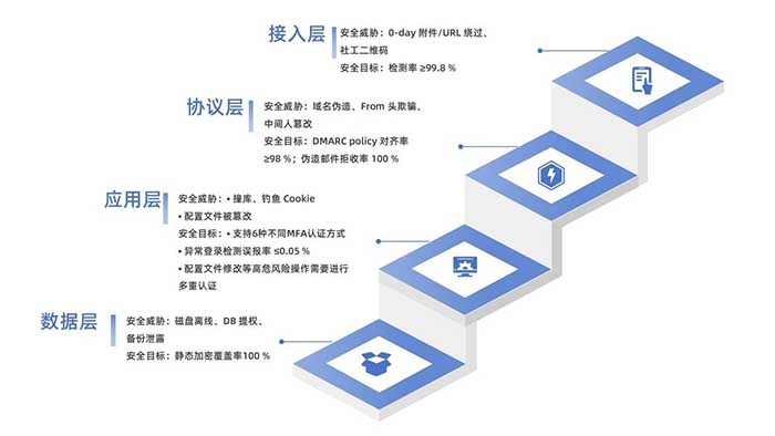 Coremail遵循纵深防御(Defense-in-Depth)的核心思想,构建一个多层次、立体化的安全防护体系。该体系确保即使在某一层防护被突破的情况下,其他层的安全措施仍然能提供保护,层层设防,最大限度地保障客户信息资产的机密性、完整性和可用性。