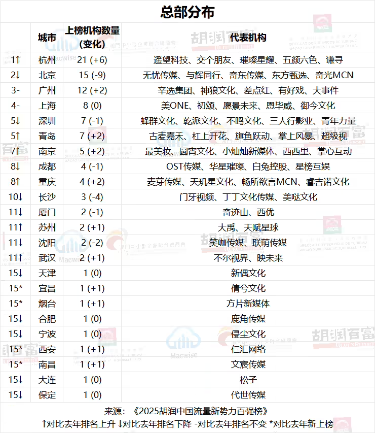IT之家从报告获悉,《2025 胡润中国流量新势力百强榜》上榜机构平均拥有 2.8 亿粉丝,平均签约达人 530 人。此次新上榜机构 34 家。同时有 20 家机构落榜,主要原因包括机构解散、核心达人离开等。百强机构分布于 23 个城市,其中七成位于杭州、北京、广州、上海、深圳、青岛这六大城市。有 4 家上榜机构的母公司为上市公司。