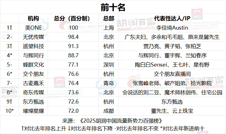 与辉同行新上榜,排名第四。由“胡润最具商业价值的直播带货达人”第二名董宇辉创立。董宇辉曾是东方甄选旗下,2024 成立独立工作室“与辉同行”进行直播带货。据测算,与辉同行合计 10 位主播 2025 年直播带货 GMV 超 200 亿元。