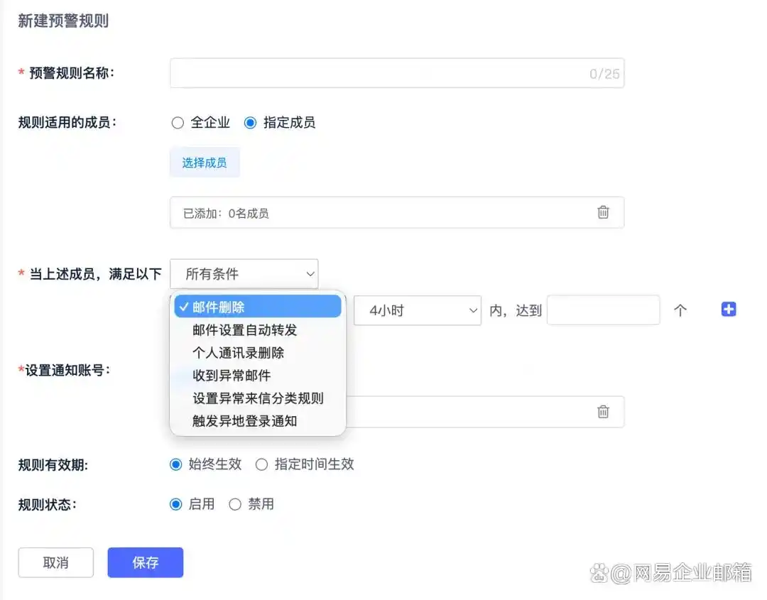网易企业邮箱支持成员异常行为预警自定义设置,管理员可根据OpenClaw相关风险(如批量操作邮件、异常登录后发送大量邮件等),设置专属预警规则,一旦员工或绑定的OpenClaw命中规则,系统会立即通知指定负责人,可第一时间阻止违规操作,降低企业资产泄露、声誉受损的风险,实现风险前置防控。