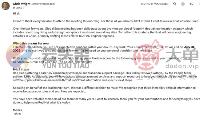2026 年 4 月 9 日,《云头条》了解到,红帽(Red Hat)正在推进其全球工程布局调整。邮件称,作为全球选址战略的一部分,将停止在中国的工程活动,并将相关工作主要转移至亚太地区的工程枢纽。受影响员工即日起不再承担日常工作职责,雇佣关系将于2026 年 7 月 31 日终止。